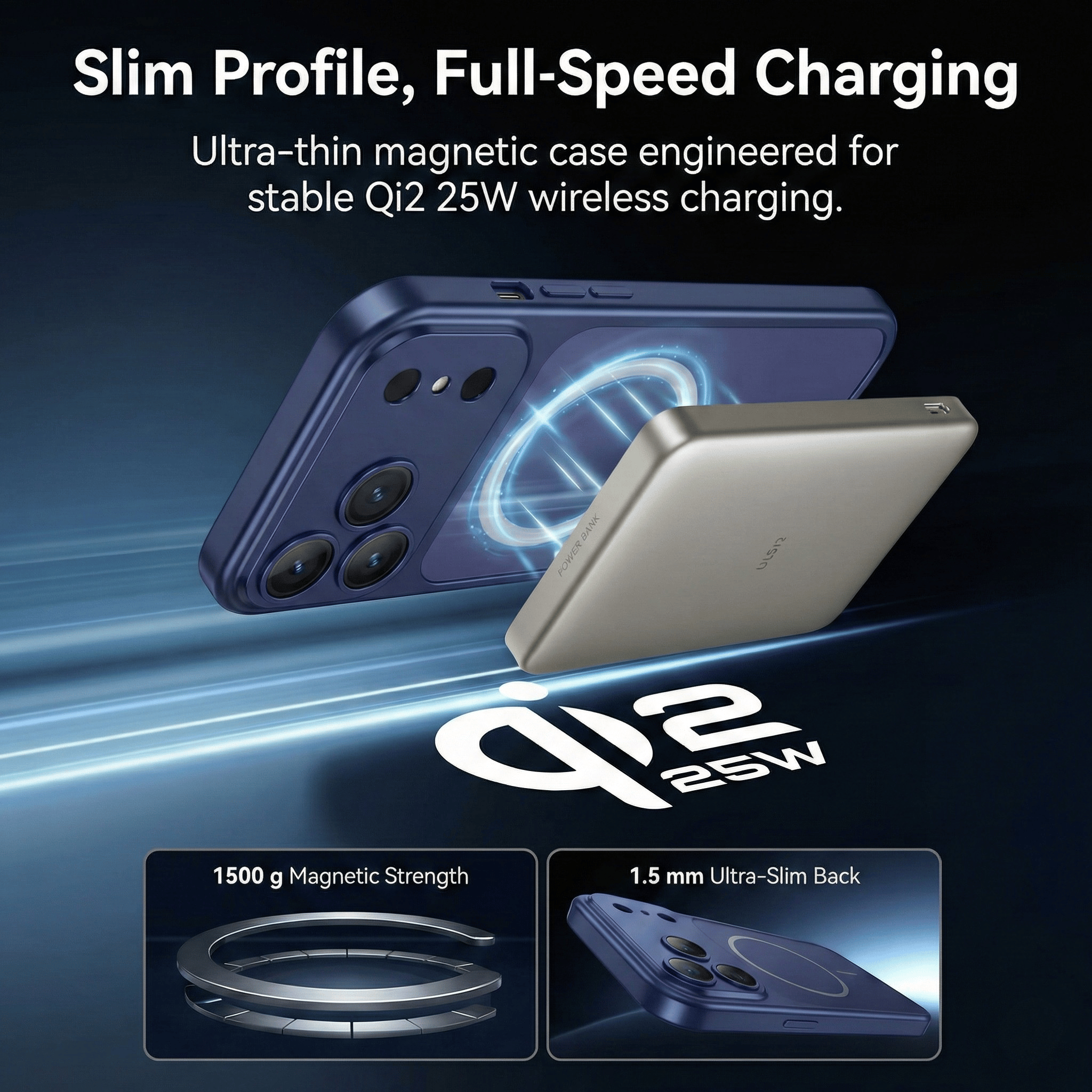 Ultra-thin magnetic armor case built for stable Qi2 25W wireless charging.
