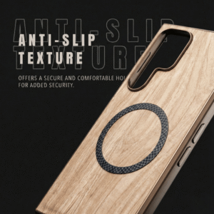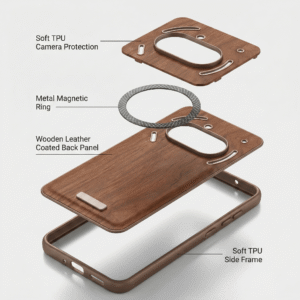 A fusion of natural wood leather texture, industrial metal and shock-absorbing TPU, designed for people who don’t like boring plastic.