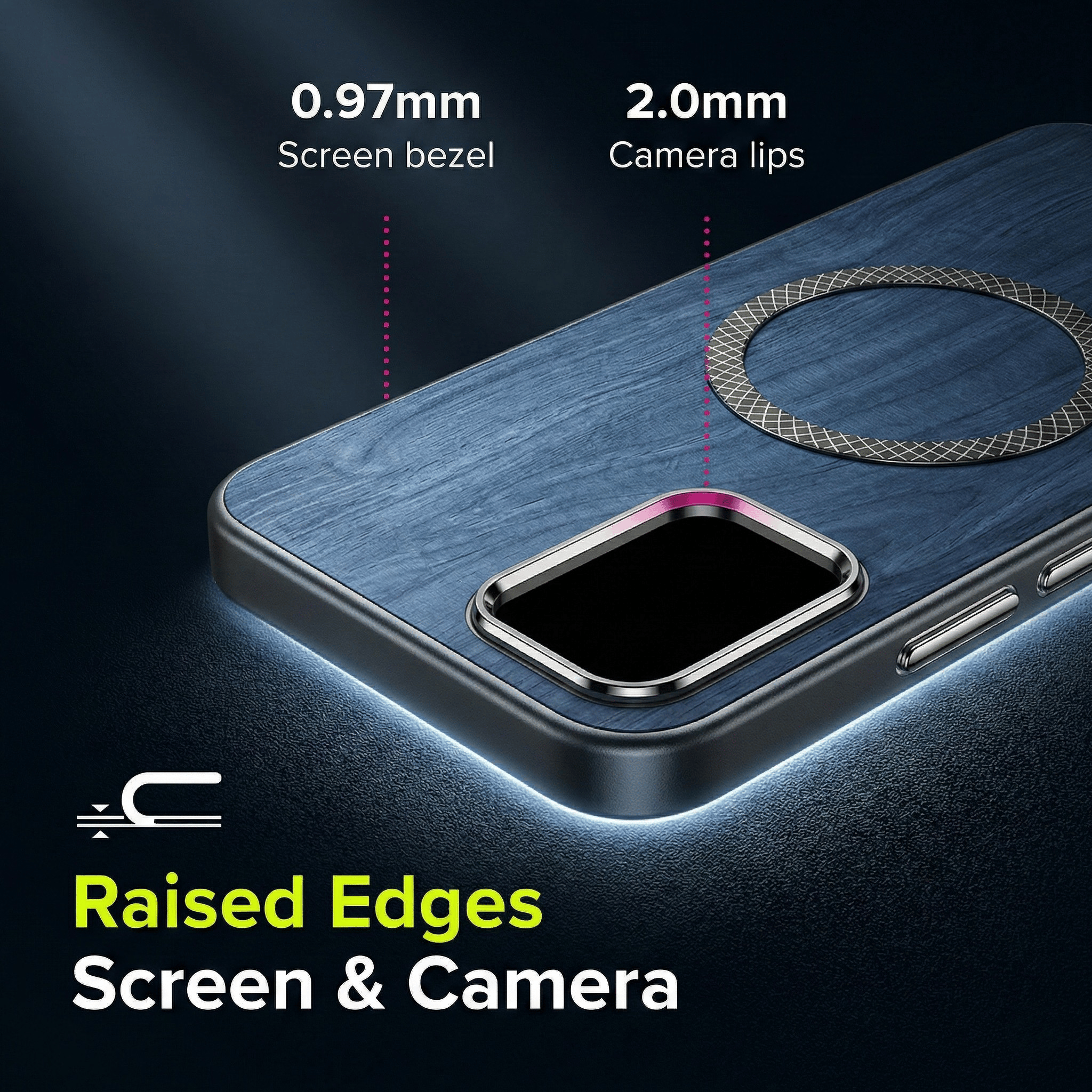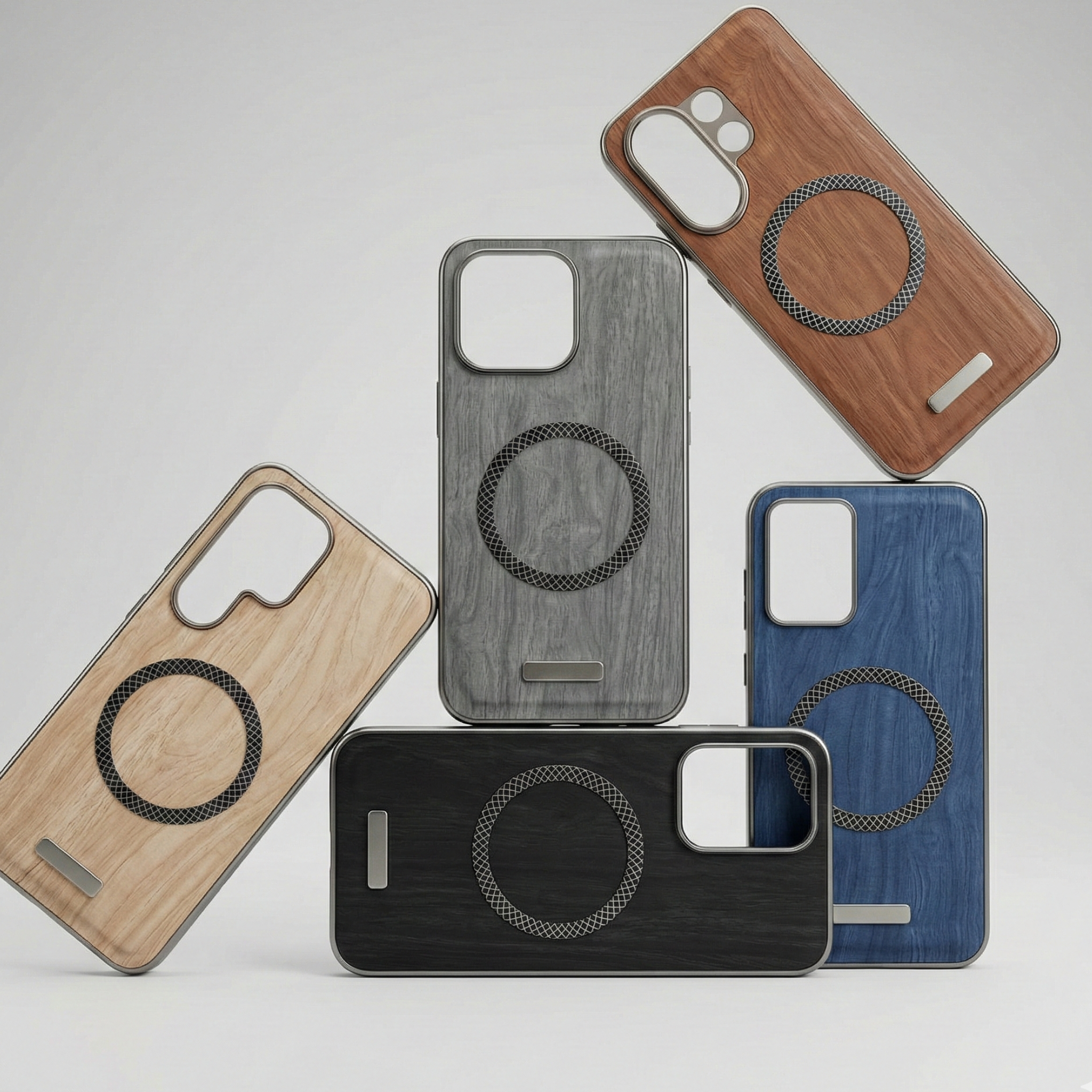 A fusion of natural wood leather texture, industrial metal and shock-absorbing TPU, designed for people who don’t like boring plastic.